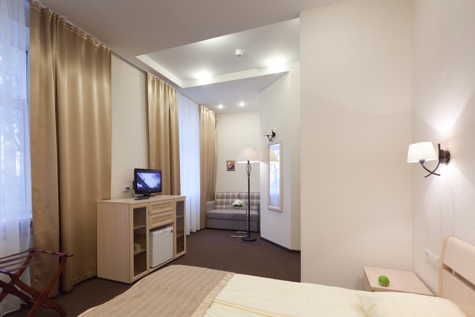Описание: просторный однокомнатный номер для размещения одного человека или семьи. По комфортности это номер класса "Люкс", отличие состоит в том, что он не разделен на 2 помещения (гостиная и спальня). Места для сна, отдыха, чаепития выделены при помощи зонирования.