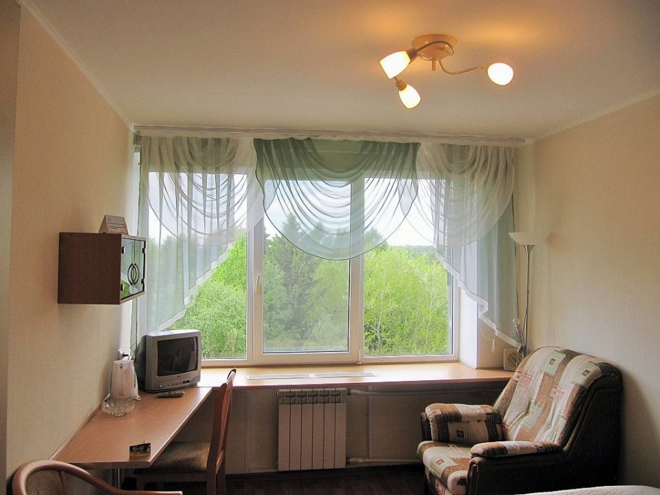 В номере: кровать, шкаф, стол, кресло, стулья, тумбочка, зеркало, телевизор, телефон, холодильник