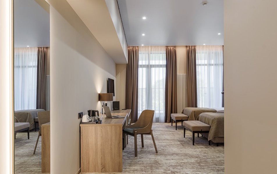 В номере: вешалка, диван, зеркало, кресло, кровать двуспальная, прикроватные тумбочки, стол, шкаф, мини-холодильник, сейф, телевизор ЖК, телефон, чайный набор посуды, электрочайник