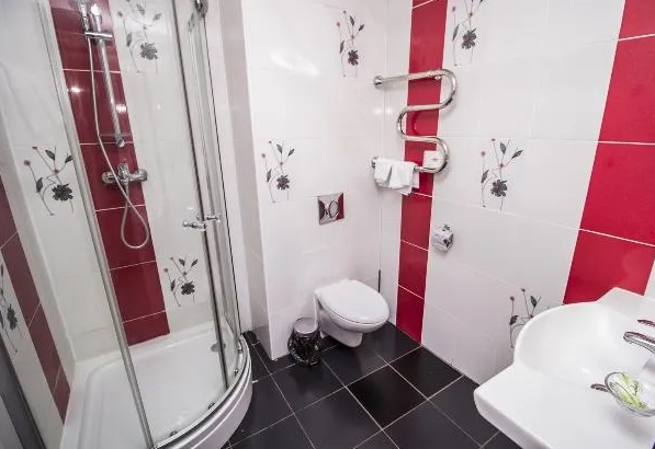 Санузел: душевая кабина, унитаз, раковина, гигиенические средства, банные полотенца, фен